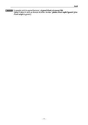 Avril Le premier avril, le coucou l’annonce : el premî d’avri, el coucou l’dit. Quand il pleut en avril, ça donnera de belles récoltes : plaûve d’avri raplit l’guerni (pluie d’avril remplit le grenier.) – 77 –