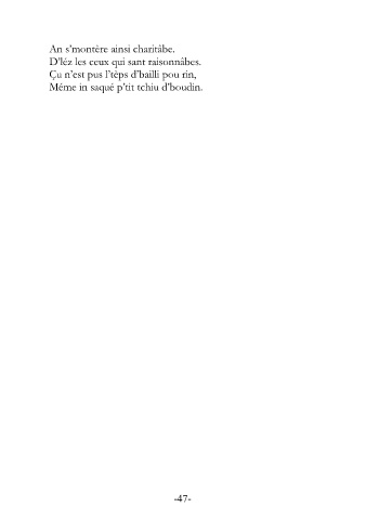 An s’montère ainsi charitâbe. D’léz les ceux qui sant raisonnâbes. Çu n’est pus l’tèps d’bailli pou rin, Méme in saqué p’tit tchiu d’boudin. -47-