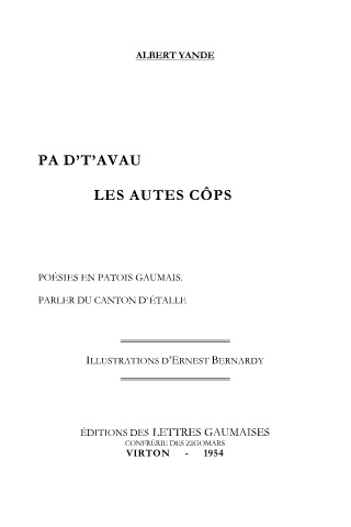 ALBERT YANDE PA D’T’AVAU LES AUTES CÔPS POÉSIES EN PATOIS GAUMAIS. PARLER DU CANTON D’ÉTALLE ILLUSTRATIONS D’ERNEST BERNARDY ÉDITIONS DES LETTRES GAUMAISES CONFRÉRIE DES ZIGOMARS VIRTON - 1954