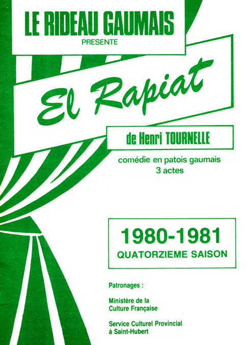 El Rapiat (programme) Rideau Gaumais - Henri Tournelle Programme papier de la pièce Rideau Gaumais, Saint-Léger, 1980. |