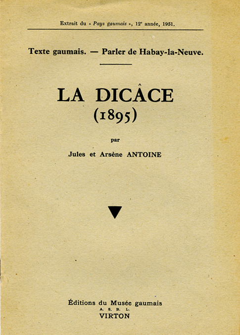 La dicâce Jules et Arsène Antoine Texte en vers (gaumais) Musée Gaumais, Virton, 1951. |